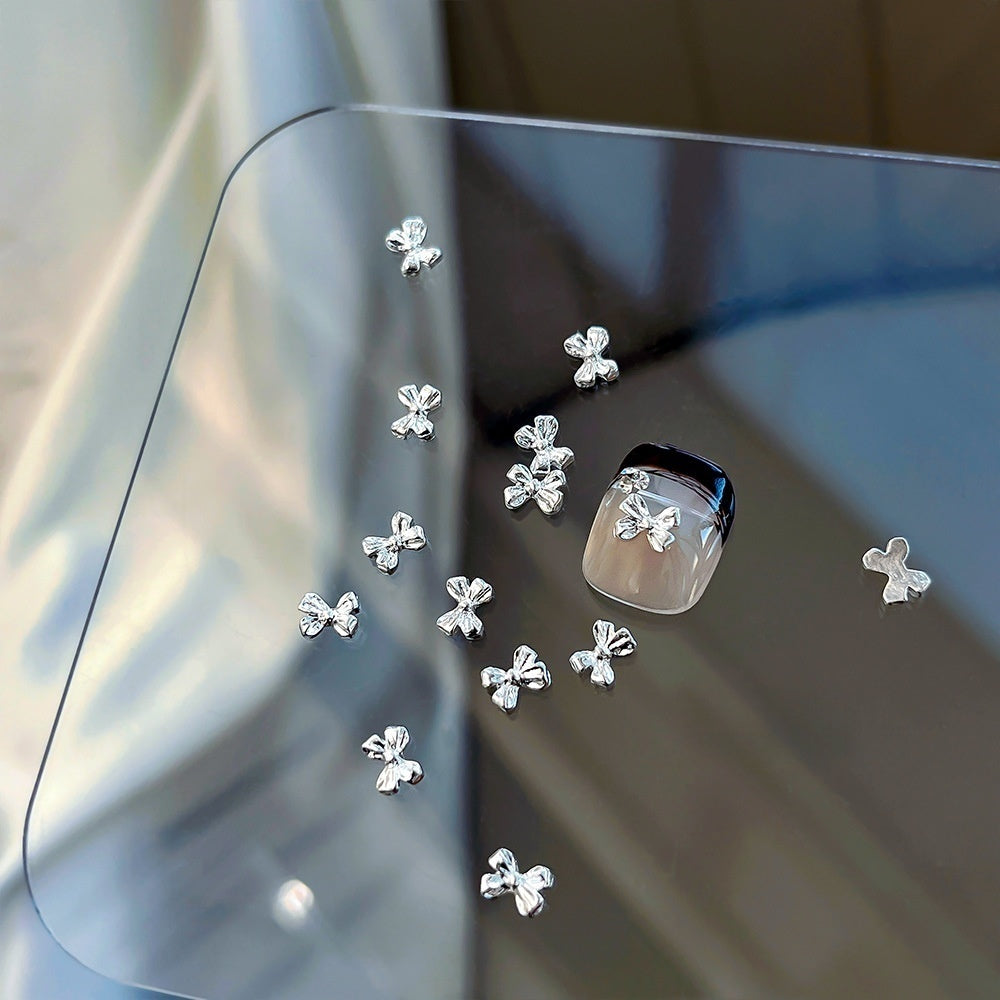 Add a soft, feminine sparkle to your nail designs with these medium-sized silver white butterfly bow charms. Crafted with a sleek metallic finish, each piece reflects light beautifully for a chic, graceful effect. Their compact 6×5mm size makes them ideal for accent nails, bridal designs, or everyday glam looks.